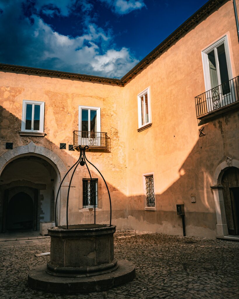 La strada di accesso al complesso monumentale è un ampio viale lastricato in pietra che parte dalla sottostante Piazza Neviera.